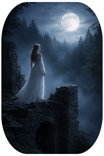 Vor sehr, sehr vielen Jahren stand auf dem Ahlberg eine trutzig stolze Burg. Sie beherrschte den gesamten südlichen Teil des Reinhardswaldes. Diese Burg war derart massiv und wehrhaft erbaut, dass sie als allgemein uneinnehmbar galt. Der junge Burgherr hatte gerade Hochzeit gehalten und sein junges Weib heimgeführt, als ihm Herolde Kunde von einem großen Heerzug brachten. Mit viel Freude vernahm er die Botschaft, dachte zugleich aber an seine arme Frau, die traurig zurück bleiben würde. Damit sie nicht unnötig weinen müsse, sagte er ihr nichts von seinem bevorstehenden Aufbruch, denn der Abschied selbst würde schon schwer genug werden. So konnten sie bis dahin noch glückliche Tage erleben. Dann aber hieß es Abschied nehmen, damit die Ritter noch rechtzeitig am Sammelplatz ankämen. Der junge Burgherr reichte seiner Gemahlin die Hand. Erschreckt warf sie sich an seine Brust und bat ihn inständig, er möge doch bleiben. Schweren Herzens riss er sich aus ihrer Umarmung und versprach, gleich nach bestandener Schlacht zu ihr zurück zu kehren. Bis dahin würde der Mond ihnen jeden Abend ihre Liebesgrüße überbringen. So stieg die Schöne Gemahlin Abend für Abend auf die hohen Burgmauer, um dem Mond die Grüße für den geliebten Gatten mit der Bitte des Überbringens anzuvertrauen. Eines Tages aber kam ein Bote geritten mit der Nachricht vom frühen Tode des jungen Ritters. Als er der Herrin die traurige Botschaft überbrachte, brach sie auf der Stelle tot zusammen. Die junge Frau wurde in ihrem prächtigen Brautkleid auf der Burg begraben. Das Band der Liebe zu ihrem Gemahl aber vermochte der Tod bis zum heute nicht zu zerreißen. In mondhellen Nächten entsteigt die Schöne ihrem Grab, um ihren lieben Gatten zu grüßen. Späte Spaziergänger können die weiße Gestalt dann auf dem Berg sehen. Auch sind die Reste der Burgmauer noch erhalten.